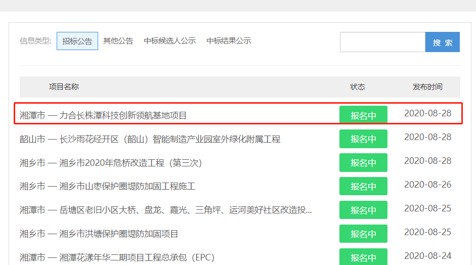 力合长株潭科技创新领航基地项目施工总承包工程招标在湘潭市公共资源交易中心进行公开招标,有投标意愿者,请于 2020 年8月 28 日起在湘潭公共资源交易中心网站http://ggzy.xiangtan.gov.cn/project/18369.jspx?channelId=15下载数据电文形式的招标文件。