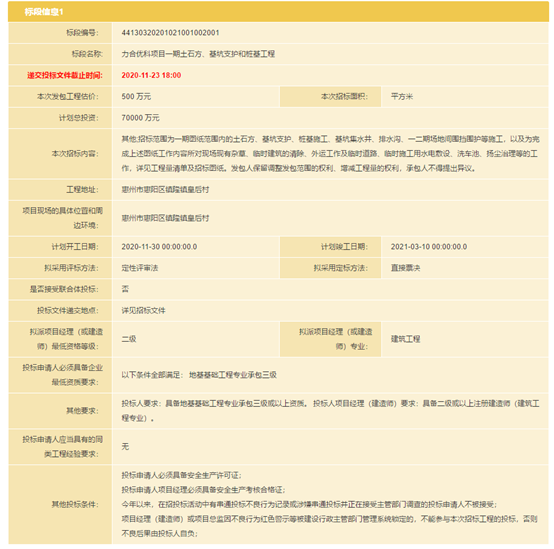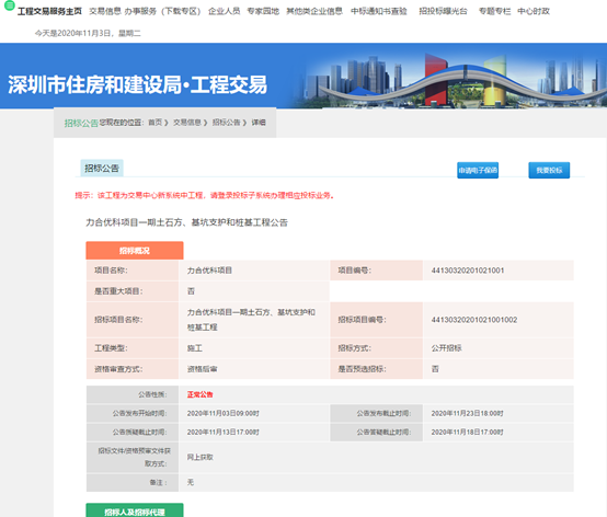 力合优科项目一期土石方、基坑支护和桩基工程在深圳市公共资源交易中心发布招标公告