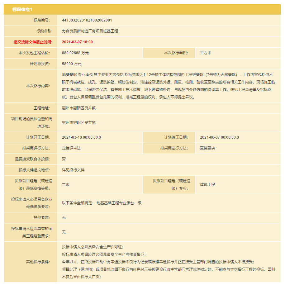 力合良景新制造厂房项目桩基工程 在深圳市公共资源交易中心发布招标公告